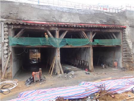 該項工程是國內第一次大規模采用小口徑鎖扣管幕,取得較圓滿的成功。該項目共施工管幕鋼管66根,其中拱部40根,側墻26根,歷時70天。拱部管幕施工精度基本能控制在10cm以內,個別超過15cm。在管幕的保護下暗挖非常順利,初支完成后總沉降3-5cm。